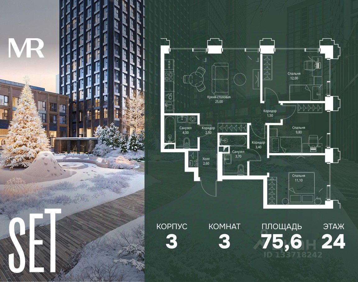 В ЖК SET продается 3-комнатная квартира площадью 75.60 м², расположенная в корпусе 3, на 24 этаже 45 этажного дома.