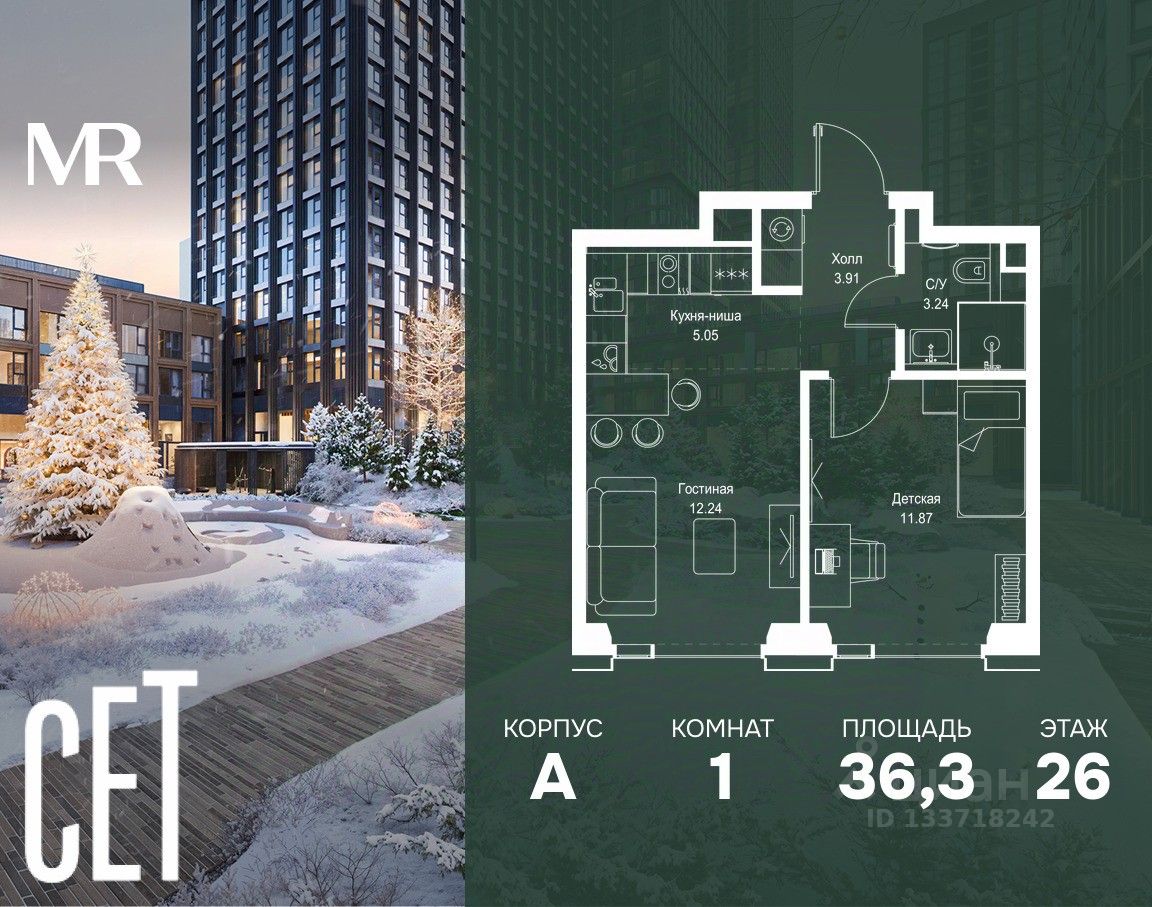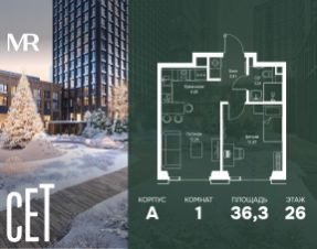 В ЖК Сет продается 1-комнатная квартира площадью 36.31 м², расположенная в корпусе А, на 26 этаже 52 этажного дома.