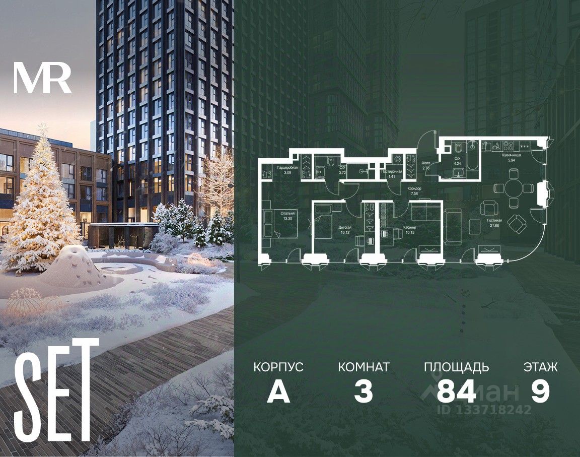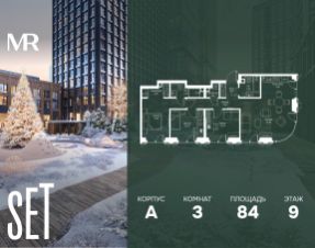 В ЖК SET продается 3-комнатная квартира площадью 83.97 м², расположенная в корпусе А, на 9 этаже 52 этажного дома.