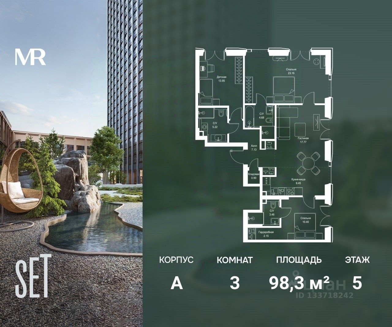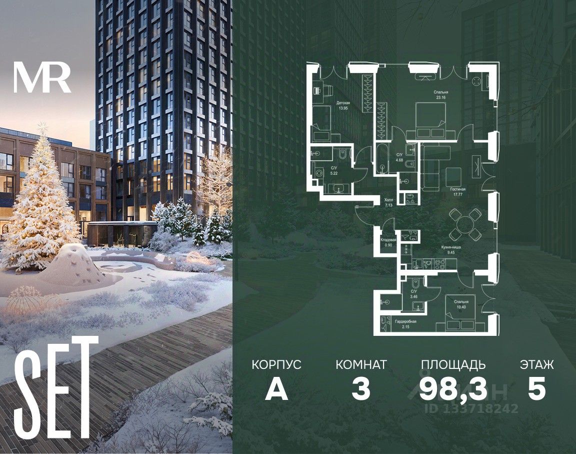 В ЖК SET продается 3-комнатная квартира площадью 98.27 м², расположенная в корпусе А, на 5 этаже 52 этажного дома.