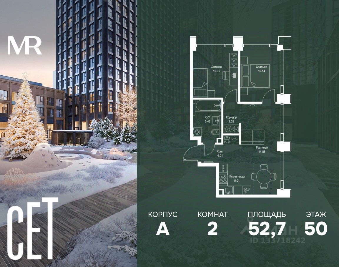 В ЖК Сет продается 2-комнатная квартира площадью 52.73 м², расположенная в корпусе А, на 50 этаже 52 этажного дома.