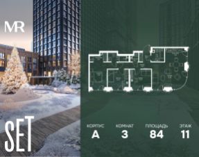 В ЖК SET продается 3-комнатная квартира площадью 83.97 м², расположенная в корпусе А, на 11 этаже 52 этажного дома.
