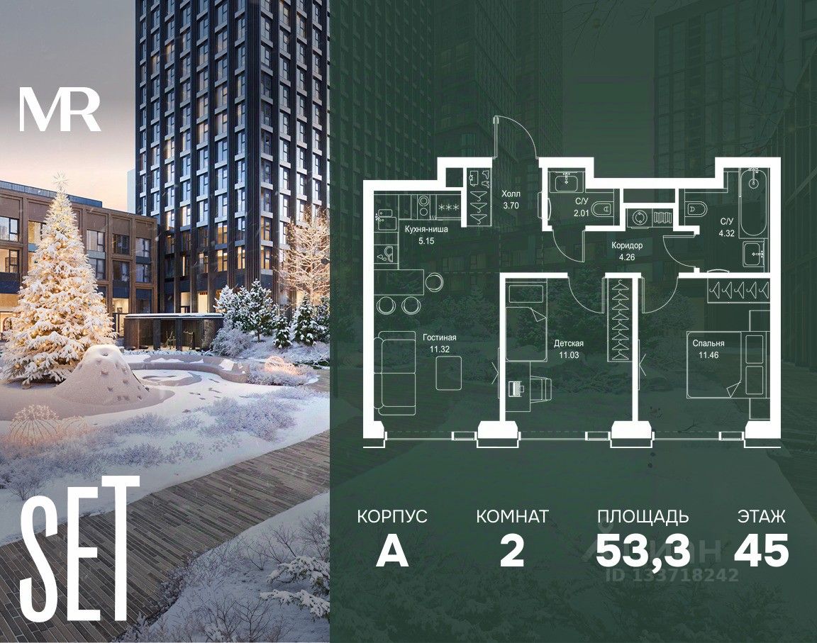 В ЖК SET продается 2-комнатная квартира площадью 53.25 м², расположенная в корпусе А, на 45 этаже 52 этажного дома.