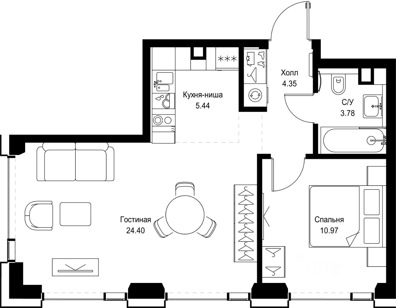 В ЖК Сет продается 1-комнатная квартира площадью 48.94 м², расположенная в корпусе А, на 45 этаже 52 этажного дома.