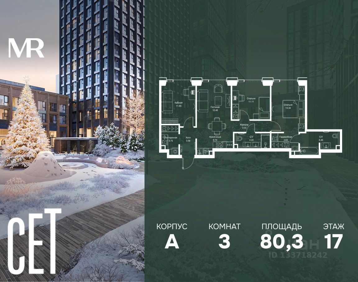 В ЖК Сет продается 3-комнатная квартира площадью 80.25 м², расположенная в корпусе А, на 17 этаже 52 этажного дома.