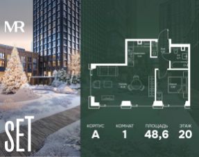 В ЖК SET продается 1-комнатная квартира площадью 48.59 м², расположенная в корпусе А, на 20 этаже 52 этажного дома.