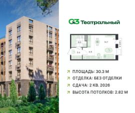 В современном квартале бизнес-класса G3 Театральный продаётся квартира-студия, общей площадью 30.3 кв.м, расположенная на 3 этаже (корпус 2, секция 6).