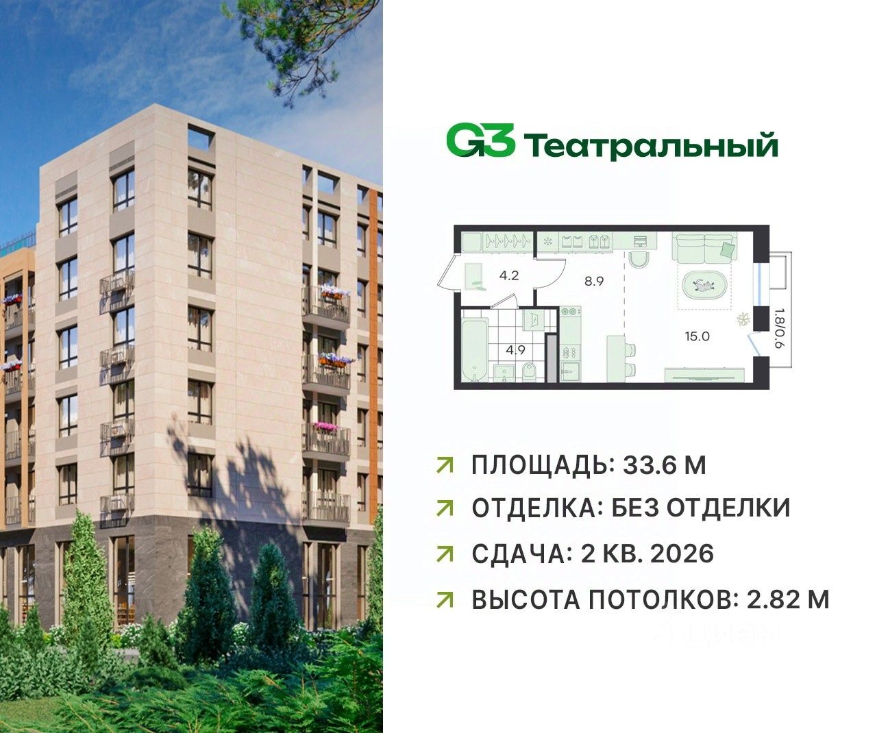 В современном квартале бизнес-класса G3 Театральный продаётся квартира-студия, общей площадью 33.6 кв.м, расположенная на 4 этаже (корпус 2, секция 5).