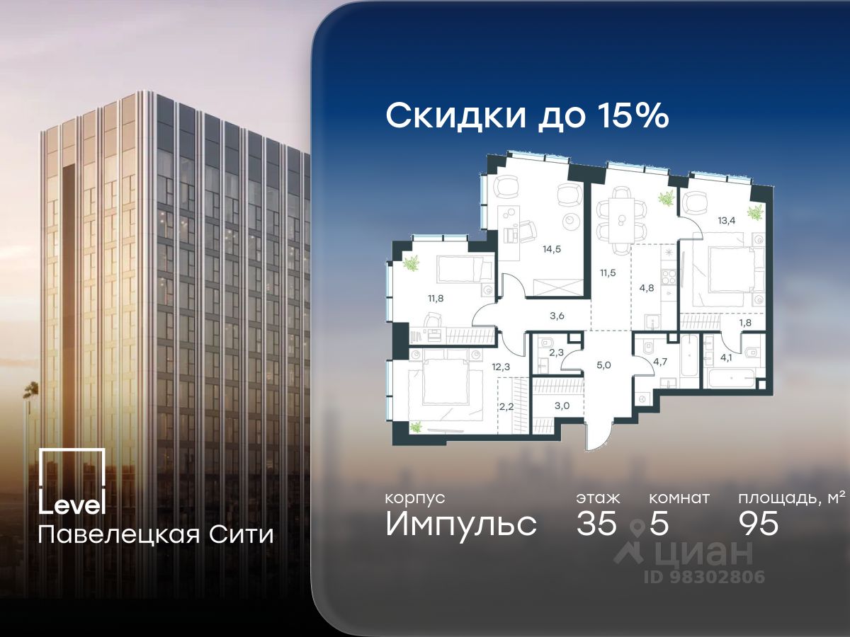В Даниловском районе столицы (ЮАО) продаётся многокомнатная квартира площадью 95.00 кв.м без отделки. Квартира расположена на 35 этаже 45-этажного корпуса 'Горизонт' в жилом комплексе бизнес-класса Level Павелецкая Сити. Высота потолков 3.00м.