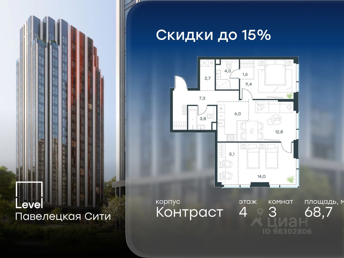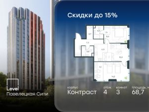 В Даниловском районе столицы (ЮАО) продаётся 3-комнатная квартира площадью 68.70 кв.м без отделки. Квартира расположена на 4 этаже 27-этажного корпуса 'Горизонт' в жилом комплексе бизнес-класса Level Павелецкая Сити. Высота потолков 3.00м.