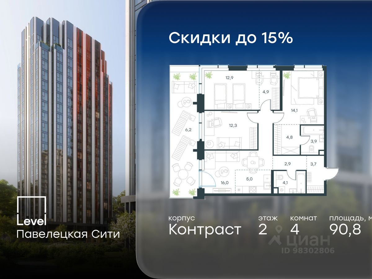 В Даниловском районе столицы (ЮАО) продаётся 4-комнатная квартира площадью 90.80 кв.м без отделки. Квартира расположена на 2 этаже 27-этажного корпуса 'Горизонт' в жилом комплексе бизнес-класса Павелецкая Сити. Высота потолков 3.00м.