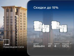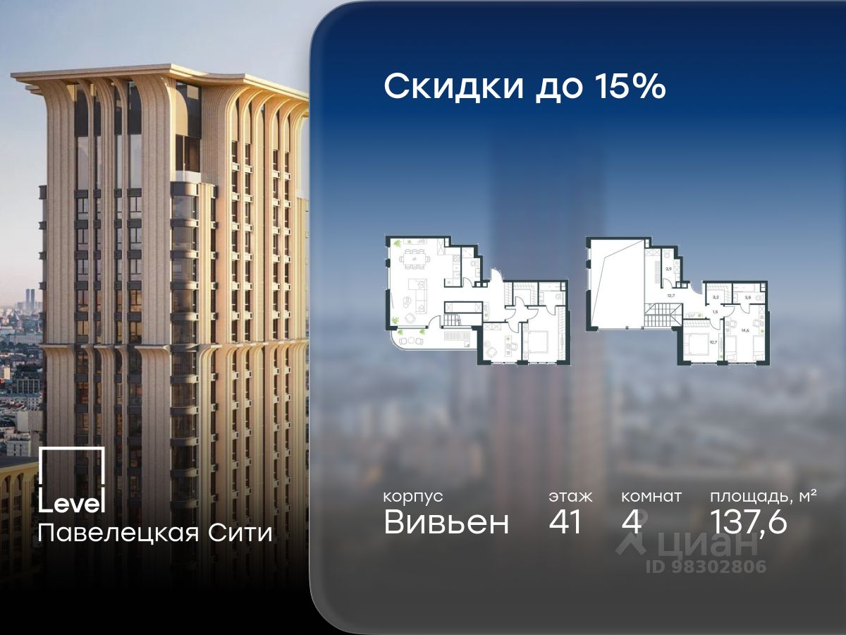 В Даниловском районе столицы (ЮАО) продаётся 4-комнатная квартира площадью 137.60 кв.м без отделки. Квартира расположена на 41 этаже 42-этажного корпуса 'Горизонт' в жилом комплексе бизнес-класса Level Павелецкая Сити. Высота потолков 3.00м.