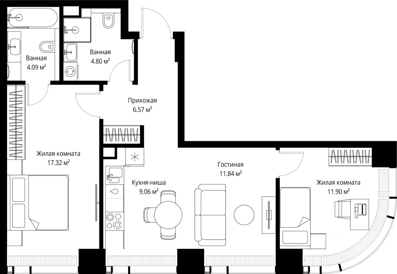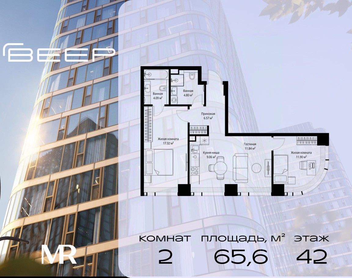 Продаётся 2-комнатная квартира общей площадью 65.58 м² без отделки в ЖК Веер на 42-м этаже 70 этажного дома.