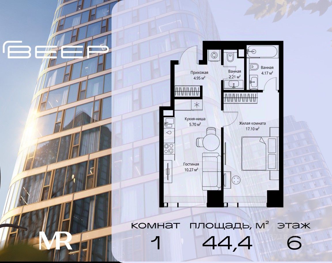 Продаётся 1-комнатная квартира общей площадью 44.40 м² без отделки в ЖК Веер на 6-м этаже 70 этажного дома.