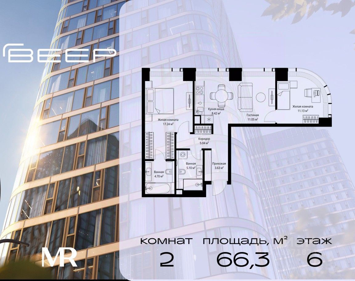 Продаётся 2-комнатная квартира общей площадью 66.31 м² без отделки в ЖК Веер на 6-м этаже 70 этажного дома.