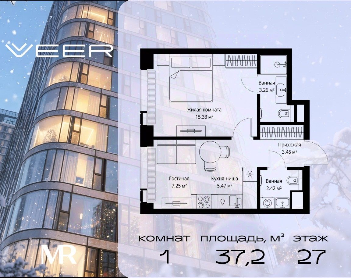 Продаётся 1-комнатная квартира общей площадью 37.18 м² без отделки в ЖК VEER на 27-м этаже 35 этажного дома.