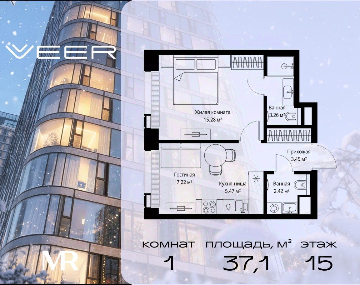 Продаётся 1-комнатная квартира общей площадью 37.10 м² без отделки в ЖК VEER на 15-м этаже 59 этажного дома.