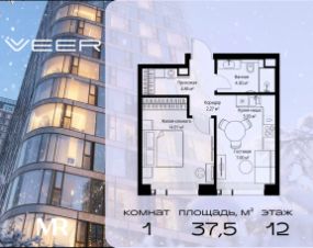 Продаётся 1-комнатная квартира общей площадью 37.47 м² без отделки в ЖК VEER на 12-м этаже 25 этажного дома.
