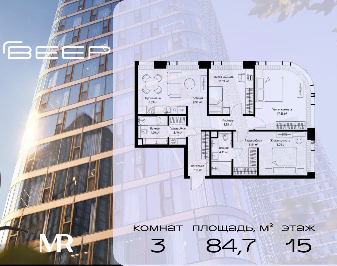 Продаётся 3-комнатная квартира общей площадью 84.73 м² без отделки в ЖК Веер на 15-м этаже 25 этажного дома.