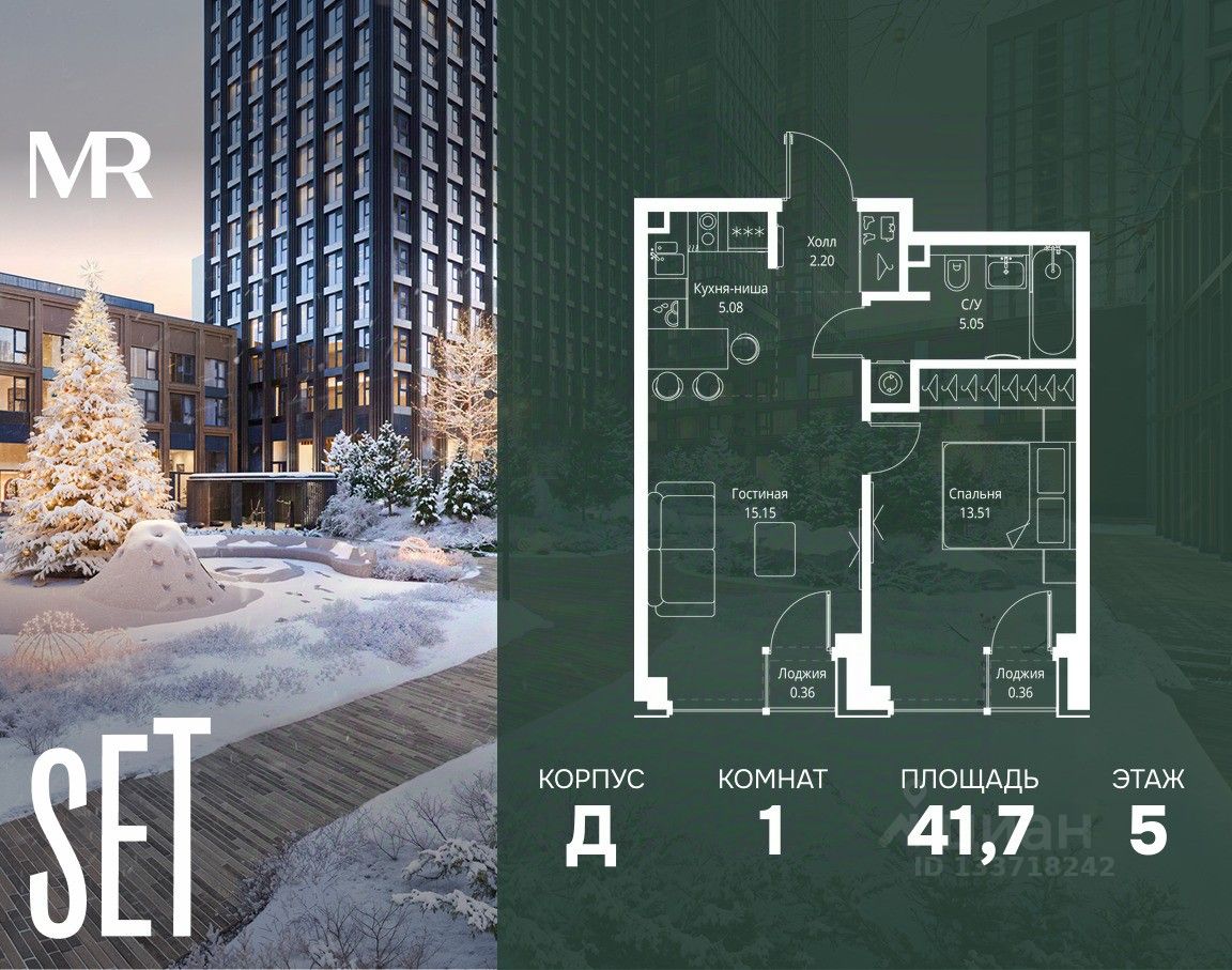 В ЖК SET продается 1-комнатная квартира площадью 41.71 м², расположенная в корпусе Д, на 5 этаже 5 этажного дома.