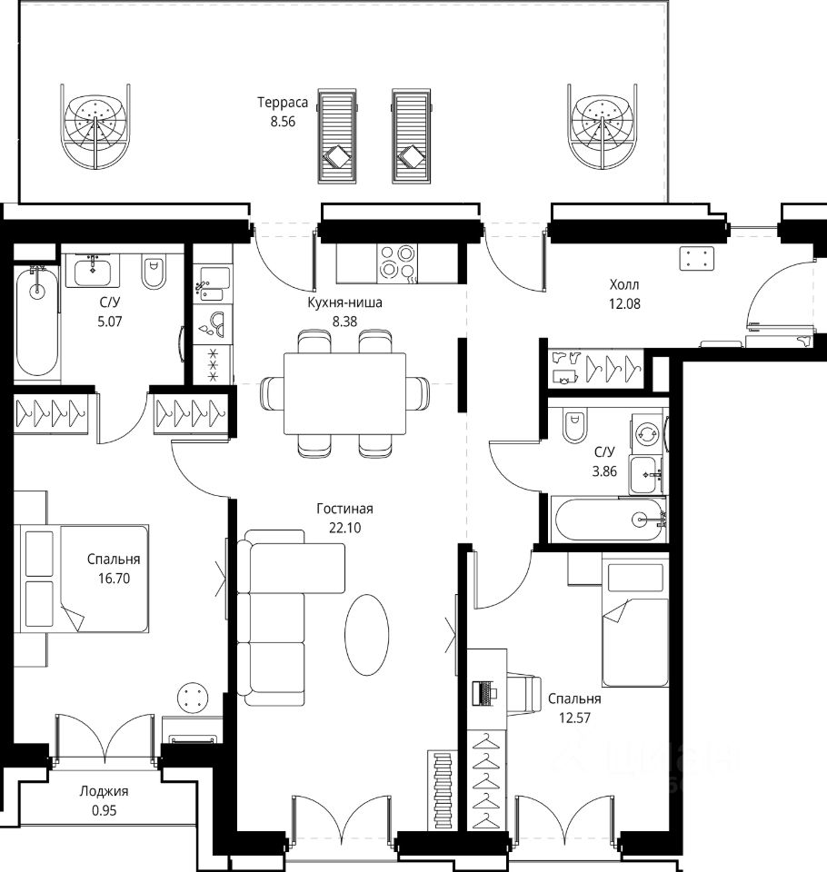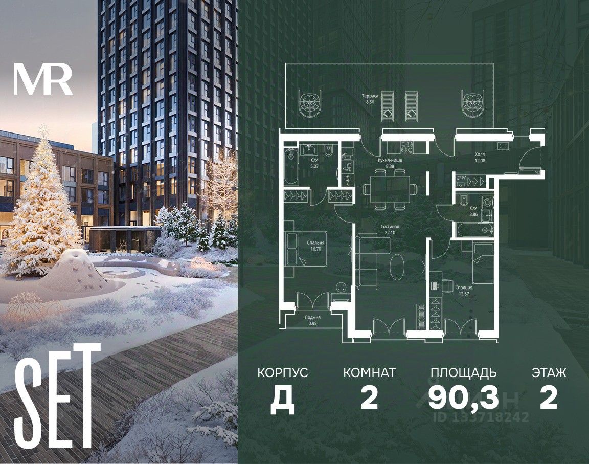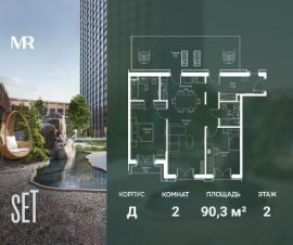В ЖК SET продается 2-комнатная квартира площадью 90.27 м², расположенная в корпусе Д, на 2 этаже 5 этажного дома.