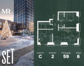 В ЖК SET продается 2-комнатная квартира площадью 59.03 м², расположенная в корпусе С, на 6 этаже 28 этажного дома.
