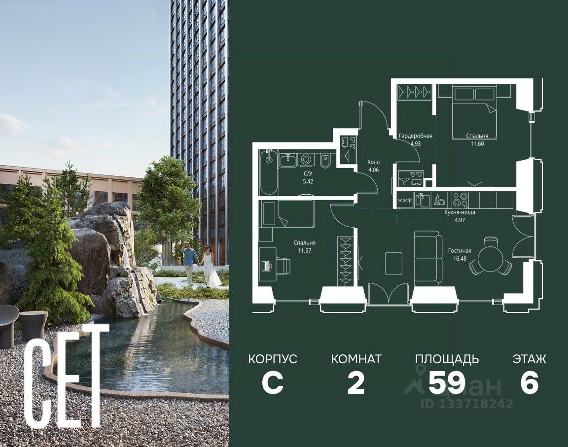 В ЖК Сет продается 2-комнатная квартира площадью 59.03 м², расположенная в корпусе С, на 6 этаже 28 этажного дома.