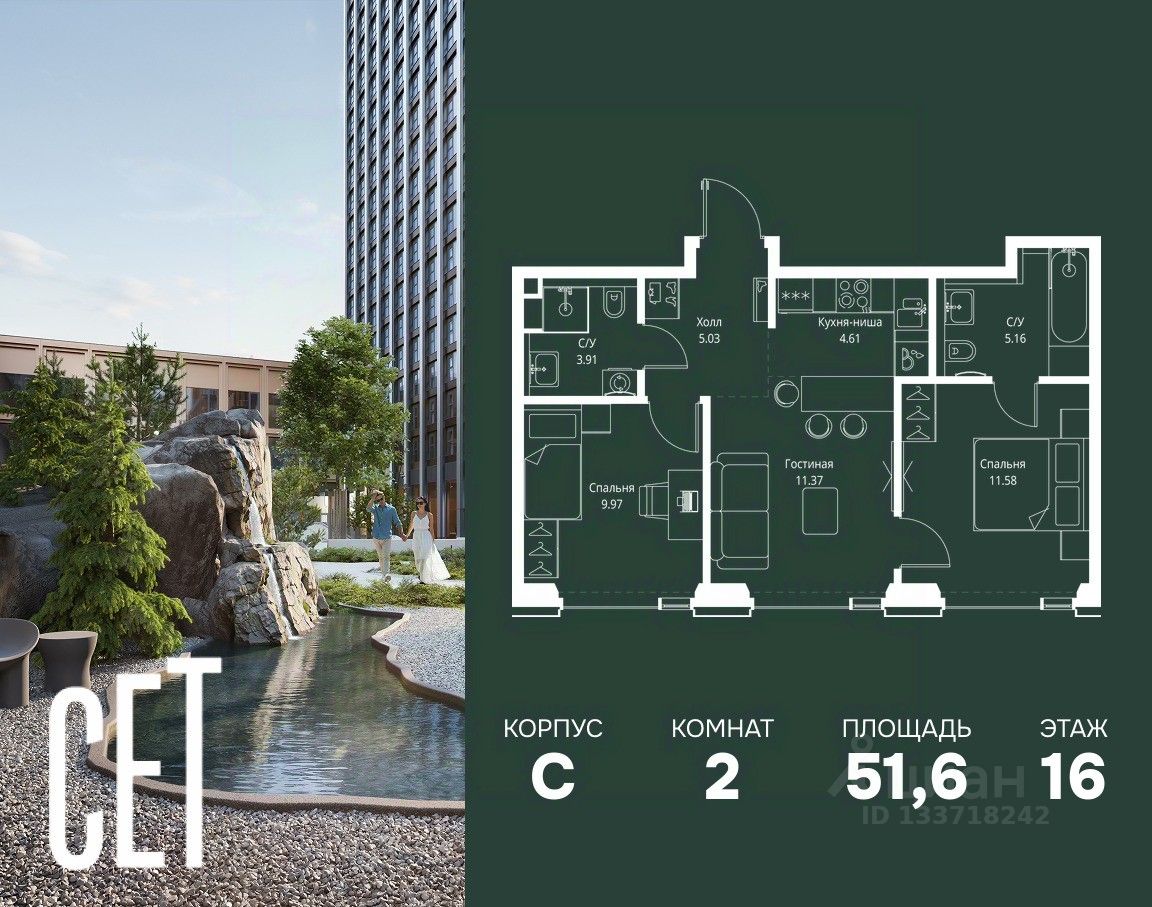 В ЖК Сет продается 2-комнатная квартира площадью 51.63 м², расположенная в корпусе С, на 16 этаже 28 этажного дома.