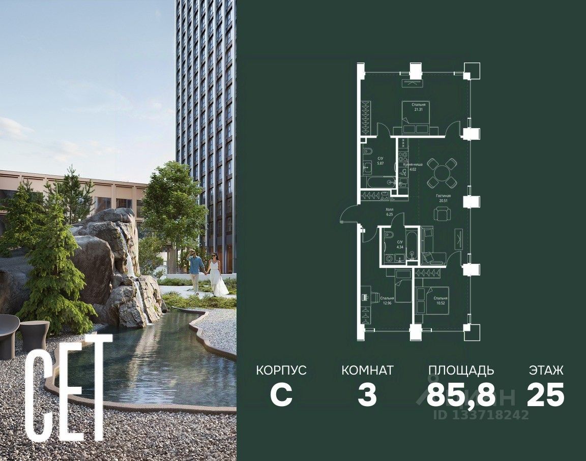 В ЖК Сет продается 3-комнатная квартира площадью 85.78 м², расположенная в корпусе С, на 25 этаже 28 этажного дома.