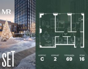 В ЖК SET продается 2-комнатная квартира площадью 69.02 м², расположенная в корпусе С, на 16 этаже 28 этажного дома.