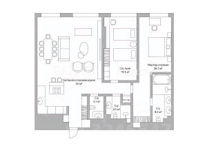 В апартаменте выполнена дизайнерская отделка. Планировочным решением предусмотрены: просторная гостиная с зоной кухни, 2 спальни, 3 санузла, постирочная.