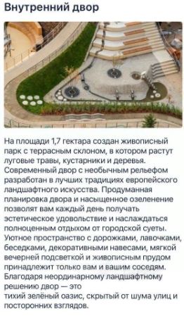-Для прогулок и отдыха предусмотрены благоустроенные дворы с декоративным освещением, декоративными водоёмами, клумбами, прогулочными зонами, а также площадками для воркаута и спортивных игр.