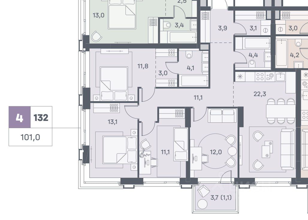 Продаётся 4-к. квартира, по переуступке прав, 10-й этаж с видом на реку.