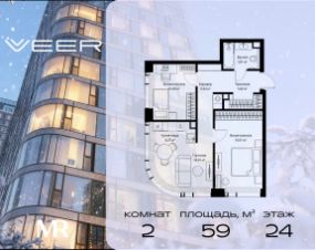 Продаётся 2-комнатная квартира общей площадью 59.02 м² без отделки в ЖК VEER на 24-м этаже 25 этажного дома.