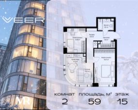 Продаётся 2-комнатная квартира общей площадью 59.02 м² без отделки в ЖК VEER на 15-м этаже 25 этажного дома.