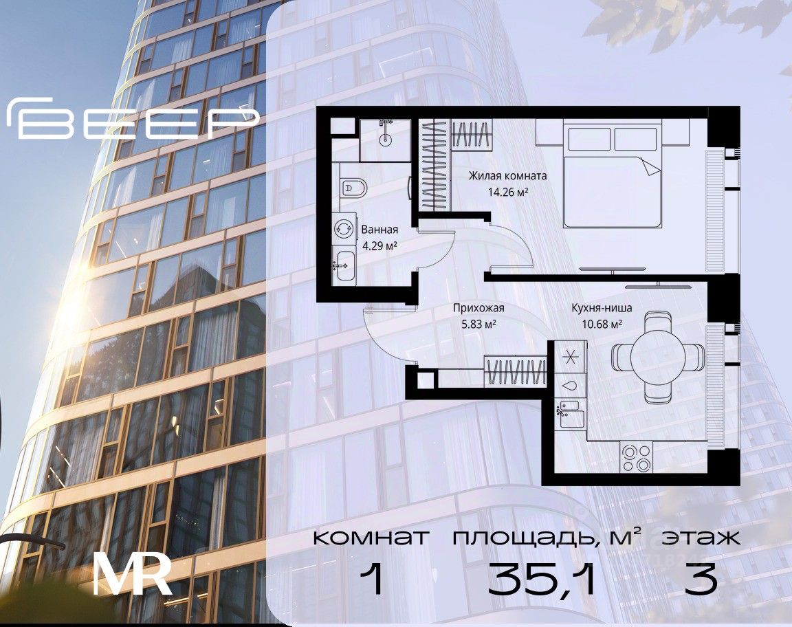 Продаётся 1-комнатная квартира общей площадью 35.06 м² без отделки в ЖК Веер на 3-м этаже 25 этажного дома.
