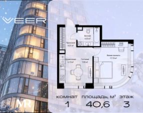 Продаётся 1-комнатная квартира общей площадью 40.57 м² без отделки в ЖК VEER на 3-м этаже 25 этажного дома.