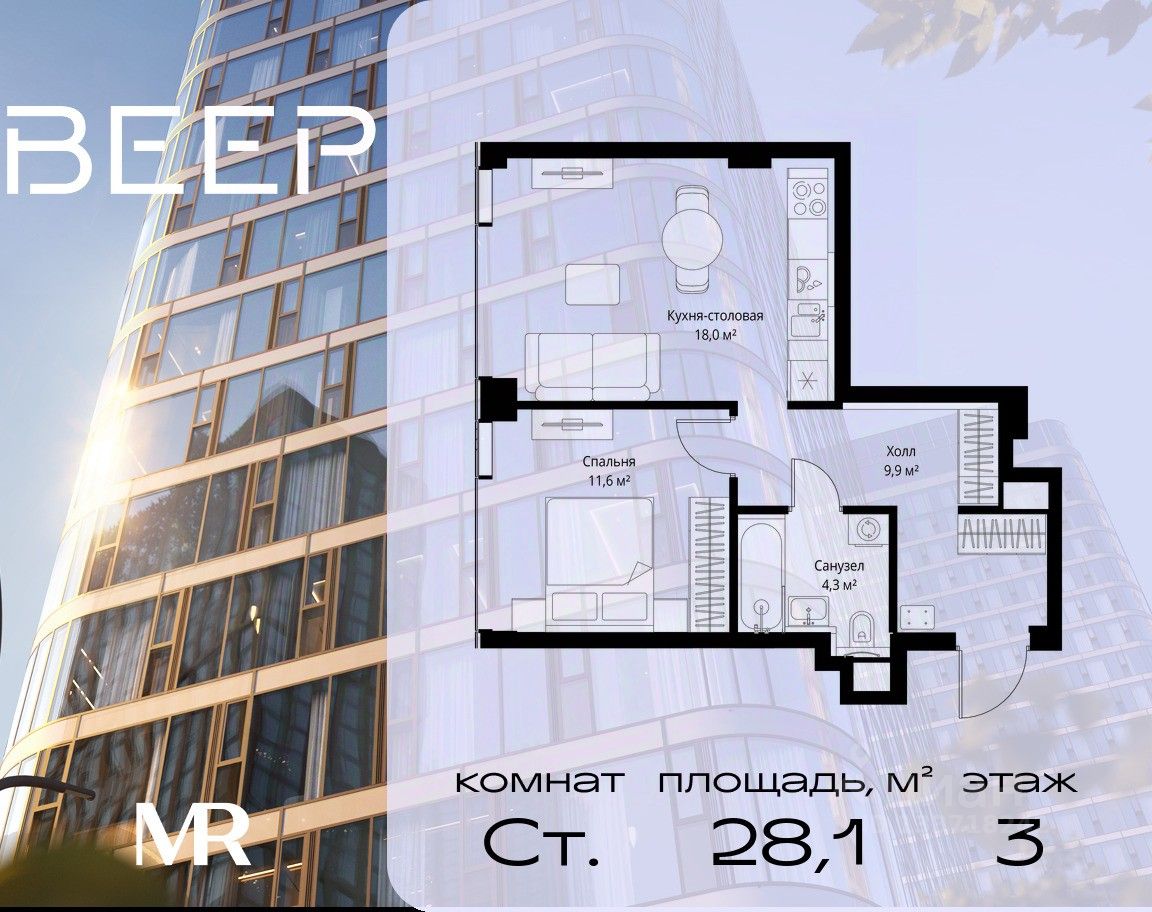 Продаётся студия общей площадью 28.13 м² без отделки в ЖК Веер на 3-м этаже 70 этажного дома.
