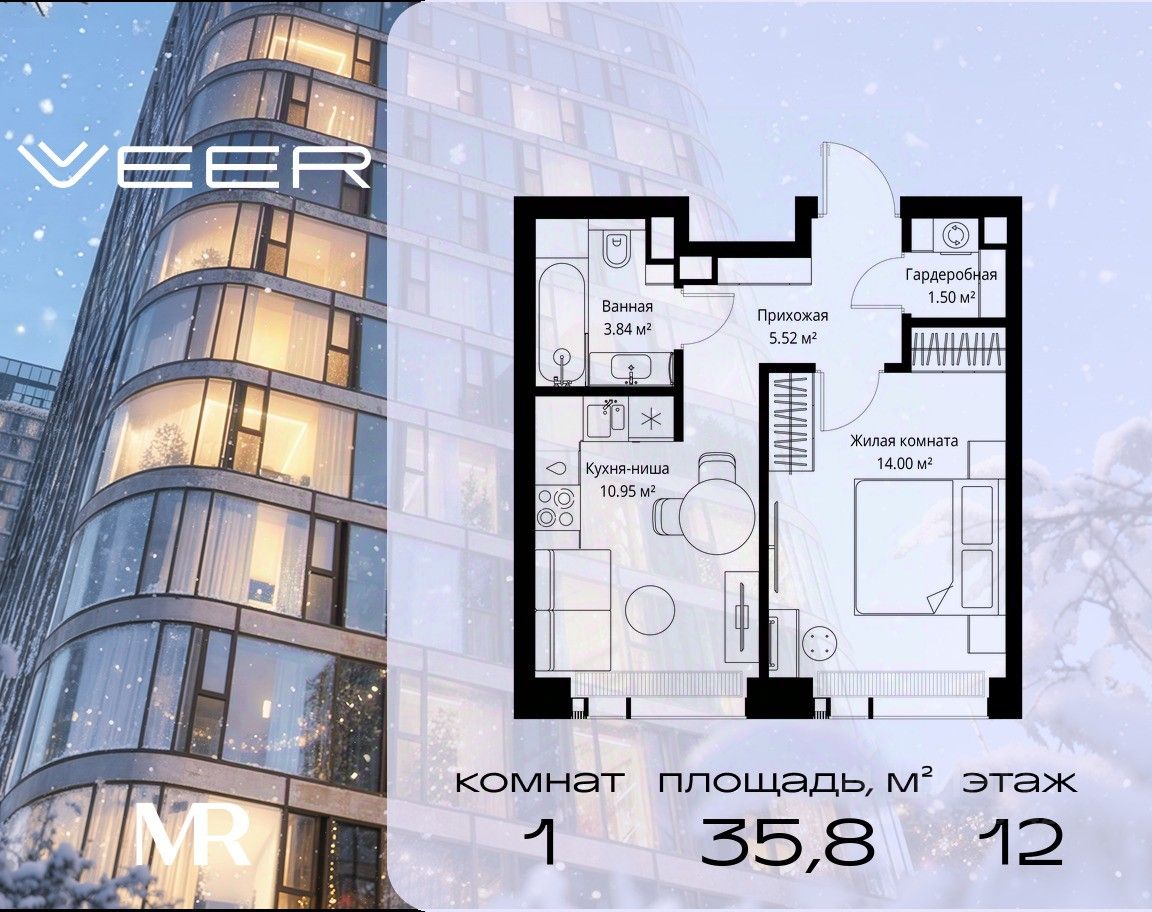 Продаётся 1-комнатная квартира общей площадью 35.81 м² без отделки в ЖК VEER на 12-м этаже 25 этажного дома.