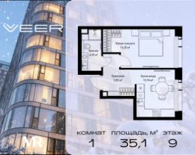 Продаётся 1-комнатная квартира общей площадью 35.14 м² без отделки в ЖК VEER на 9-м этаже 25 этажного дома.
