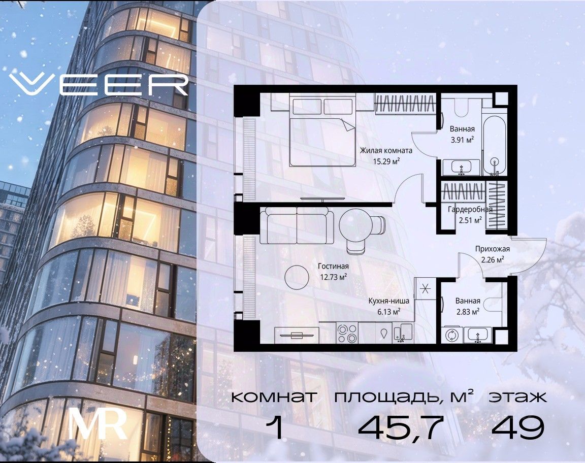 Продаётся 1-комнатная квартира общей площадью 45.66 м² без отделки в ЖК Веер на 49-м этаже 70 этажного дома.