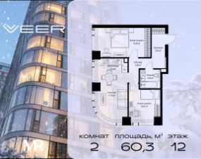 Продаётся 2-комнатная квартира общей площадью 60.30 м² без отделки в ЖК VEER на 12-м этаже 70 этажного дома.
