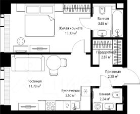 Продаётся 1-комнатная квартира общей площадью 43.75 м² без отделки в ЖК VEER на 64-м этаже 70 этажного дома.