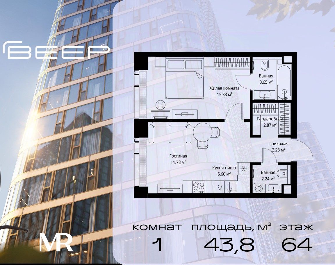 Продаётся 1-комнатная квартира общей площадью 43.75 м² без отделки в ЖК Веер на 64-м этаже 70 этажного дома.