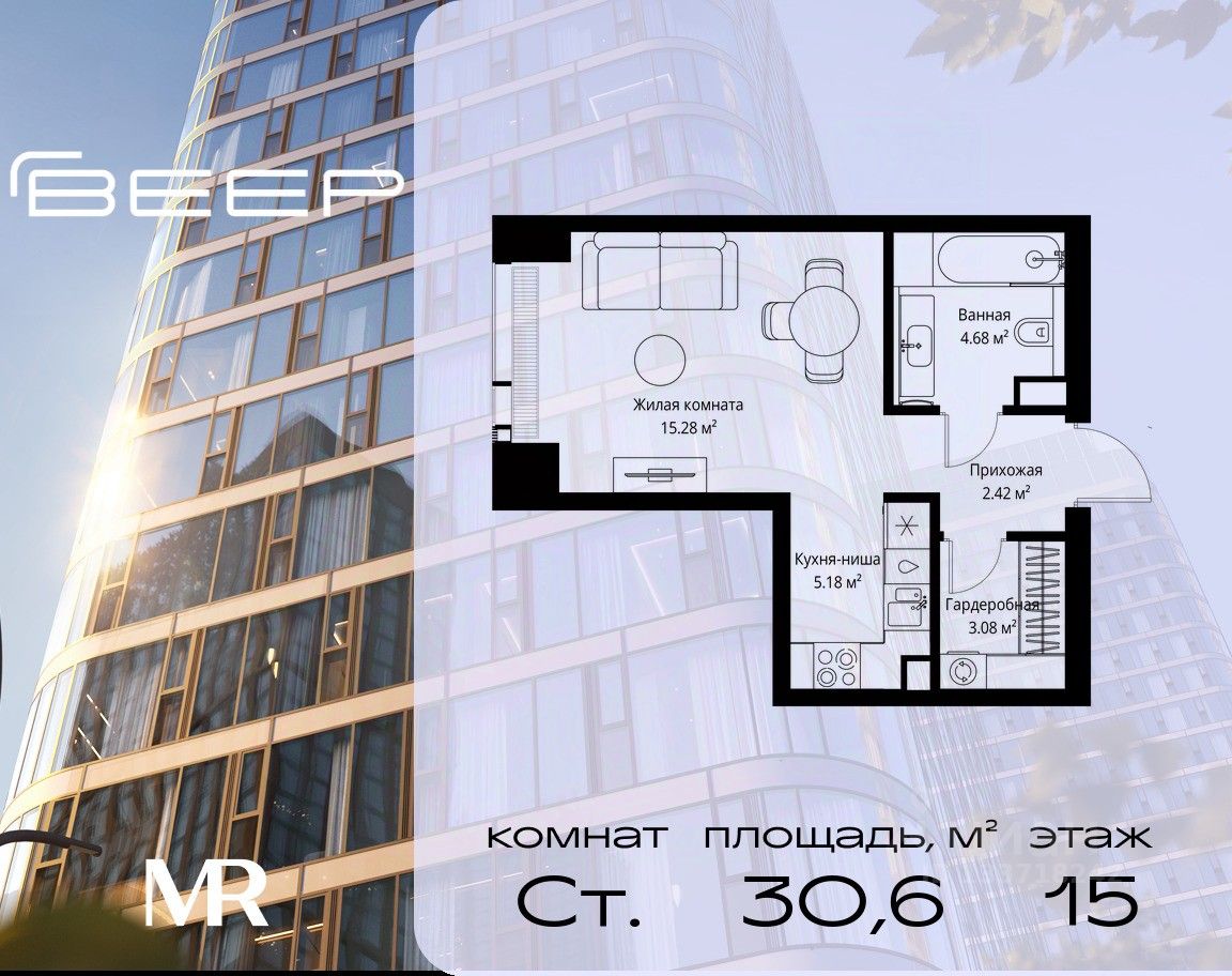 Продаётся студия общей площадью 30.64 м² без отделки в ЖК Веер на 15-м этаже 70 этажного дома.