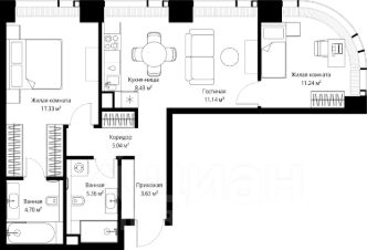 Продаётся 2-комнатная квартира общей площадью 66.87 м² без отделки в ЖК Веер на 24-м этаже 70 этажного дома.