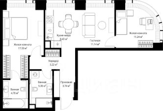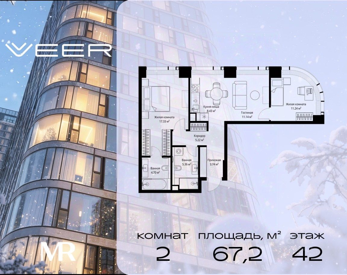 Продаётся 2-комнатная квартира общей площадью 67.16 м² без отделки в ЖК VEER на 42-м этаже 70 этажного дома.
