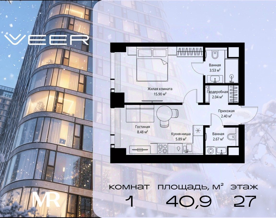 Продаётся 1-комнатная квартира общей площадью 40.91 м² без отделки в ЖК VEER на 27-м этаже 70 этажного дома.
