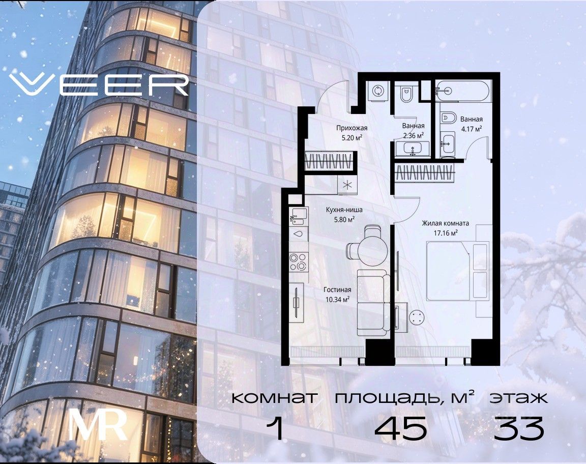 Продаётся 1-комнатная квартира общей площадью 45.03 м² без отделки в ЖК VEER на 33-м этаже 70 этажного дома.
