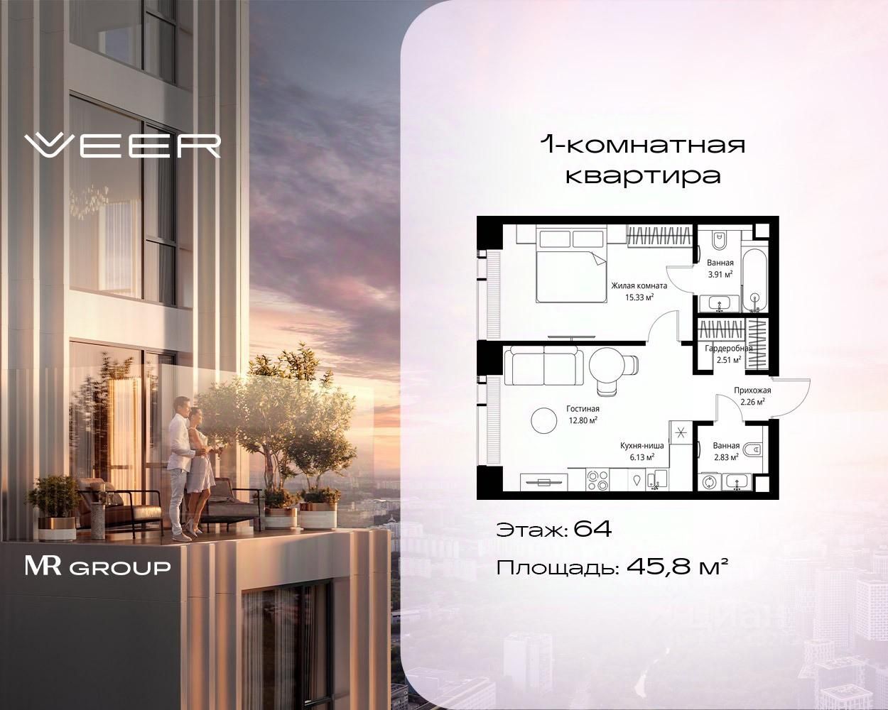 Продаётся 1-комнатная квартира общей площадью 45.77 м² без отделки в ЖК VEER на 64-м этаже 70 этажного дома.